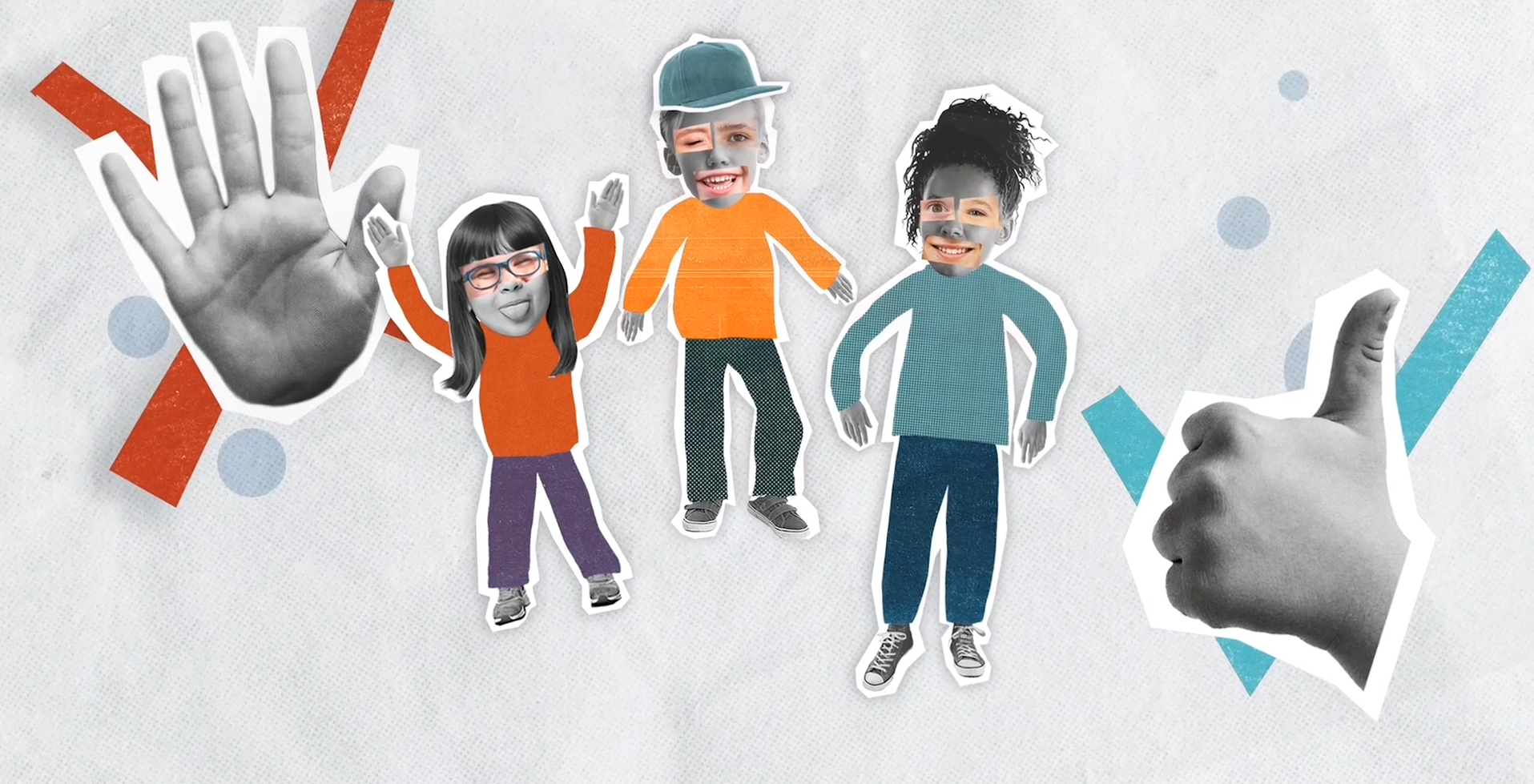 Videoen viser grafik med et dokument med Børnekonvention og et verdenskort, hvor Børnekonventionen er på. Videoen viser også børn blive holdt af en stor hånd.